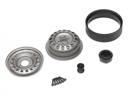 The front face is made of pressed steel for accurate scale looks. Comes with aluminum center rings and the back wheel piece is made from cast metal.