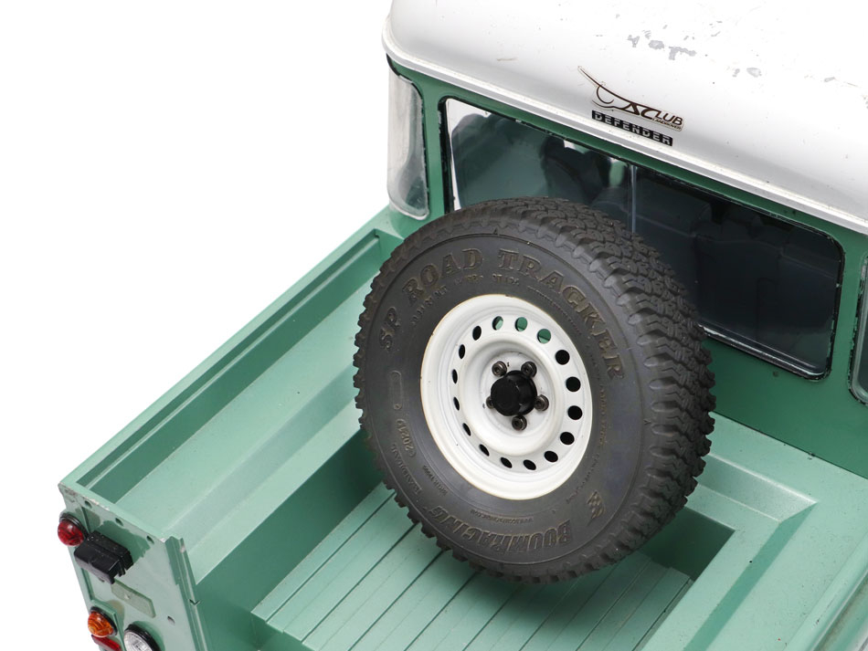 The spare tire mount is designed specifically for the Team Raffee Co. Defender pickups.