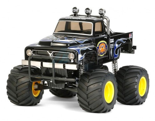 • This Tamiya Midnight Pumpkin 1/12 2WD Electric Monster Truck Kit is a re-release of the original Midnight Pumpkin first released in 1987. A highly detailed pick-up truck body that is reminiscent of the classic 1950s American designs. The special “Black Edition” body comes molded in black and features a metal-plated front grille, overhanging fenders, dampers, and roll bar. All this detail sits on top of big 115mm diameter tires. This specific kit includes a Hobbywing THW-1060 Brushed ESC for incredible performance.