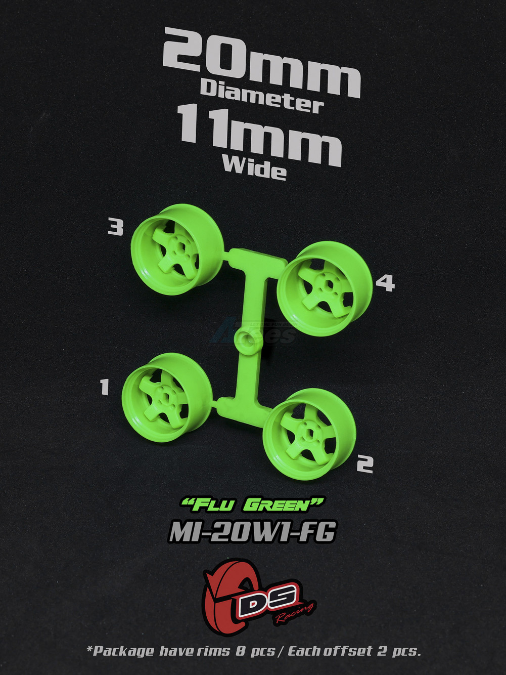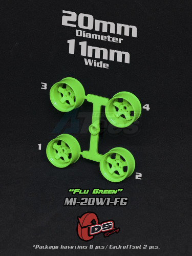 Factory description: DS Racing Mini-Z Rim Flu Green Color 11mm Wide