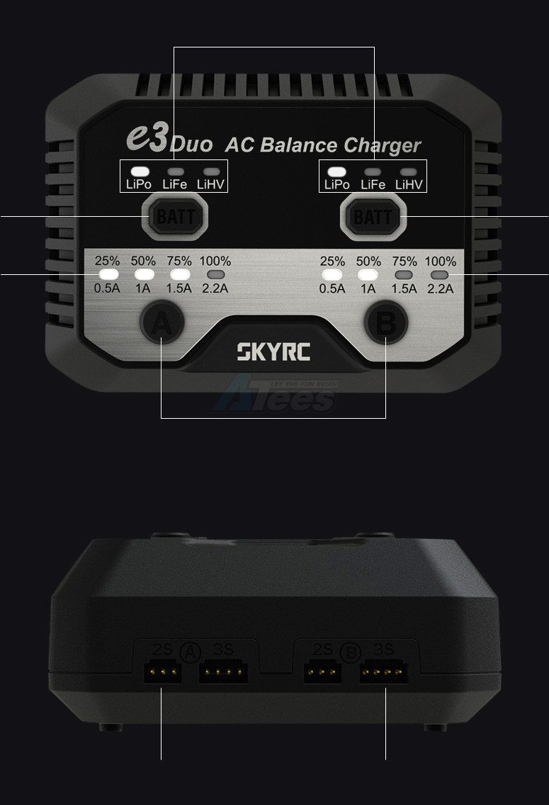 Factory description: SkyRC E3 Duo Balance Battery Charger LiPo/LiFe/LiHV 2-3S