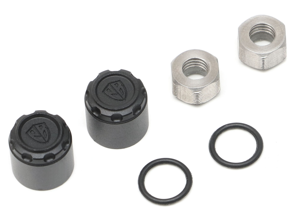 The aluminum center caps threads onto the machined M5 lock nuts. The rubber o-ring keeps the center caps in place.