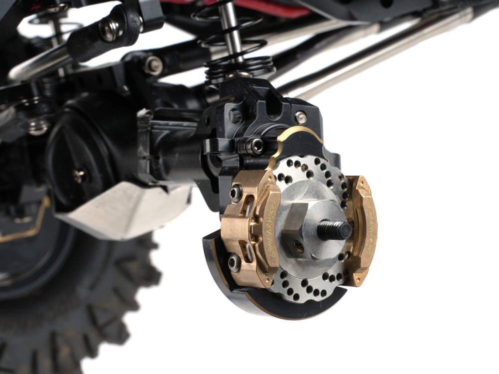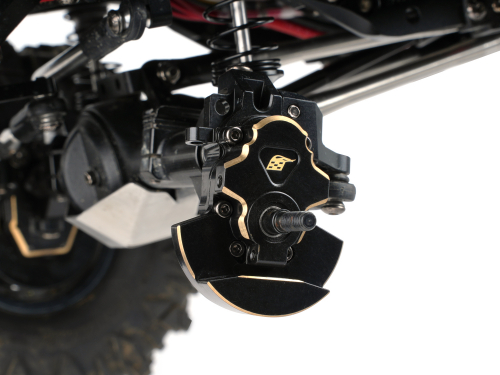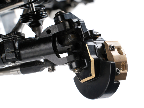 • This is a set of front brass knuckles and front brass portal covers. Anodized in black with raw brass gold trims. They add weight to the bottom of the truck, which keeps the center of gravity as low as possible. Weighs a total of 130.9 grams.