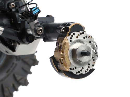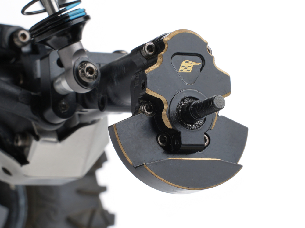 • This is a set of rear brass portal covers. Anodized in black with raw brass gold trims. They add weight to the bottom of the truck, which keeps the center of gravity as low as possible.