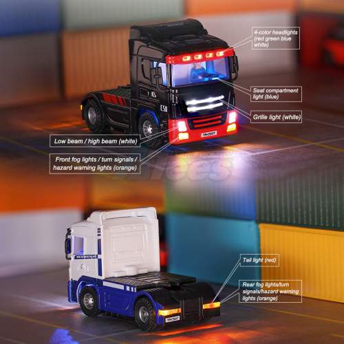 - Tractor lights: low/high beam lights, grille lights, roof lights (4 colors), seat lights, fog lights, warning lights, highlight brake lights, reversing lights, and turn lights.