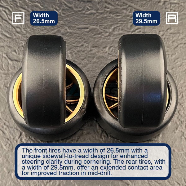 - The front tires have a width of 26.5mm with a unique sidewall-to-tread design for enhanced steering clarity during cornering. The rear tires, with a width of 29.5mm, offer an extended contact area for improved traction in mid-drift.