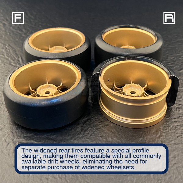- The widened rear tires feature a special profile design, making them compatible with all commonly available drift wheels, eliminating the need for separate purchase of widened wheelsets.