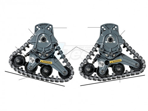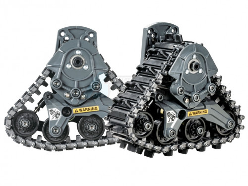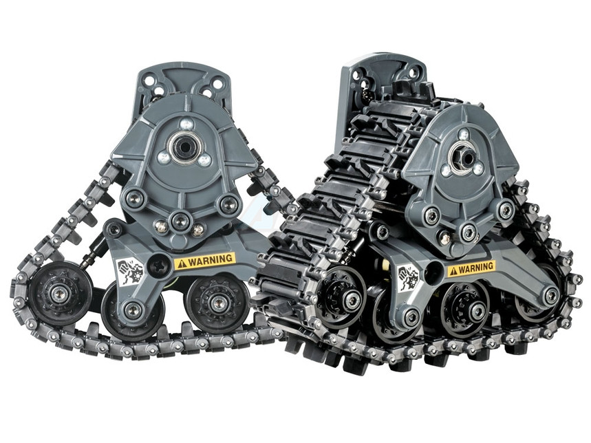 • Each track unit is composed of an upper drive sprocket connected to the chassis drive shaft to transfer power and eight individual rollers, enveloped by assembly plastic link-type tracks with soft inserts, that are connected by metal link pins.