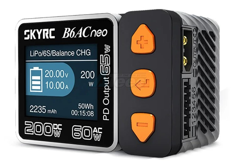 Meet B6ACneo by SkyRC, a compact evolution of the iconic iMax B6AC chargers since 2006. Stunningly smaller than a credit card, B6ACneo sports a sleek design with vibrant colors, and boasts an impressive 200W charging capacity with DC power and 60W with AC, surpassing the original B6AC's 50W AC limit. B6ACneo reduces charging time, maximizing your time in RC action.