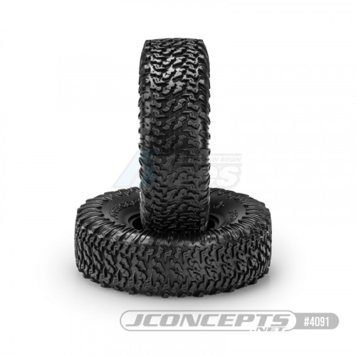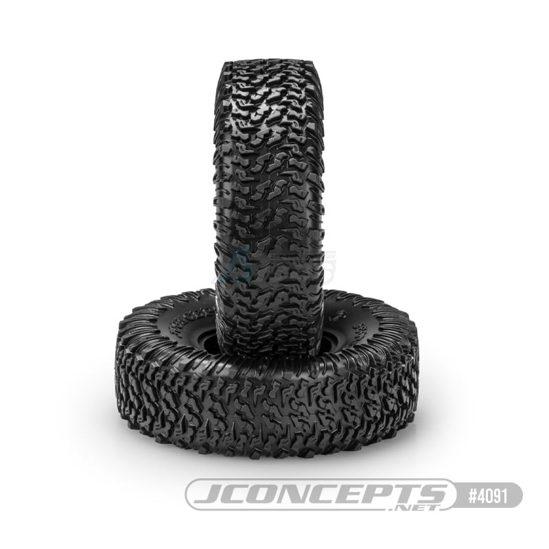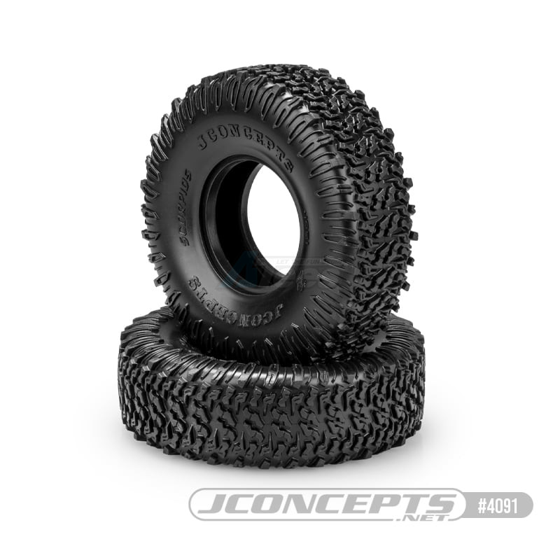 • JConcepts unveils an all-new 2.2” all-terrain scaling tire from their design department especially for class 3 crawler truck competition. The Scorpios, scale looking tread, extra tall size, and profile, jump out as the most obvious features. Starting by analyzing the tread, the design team focused on a closely knit tread and arranging them in a pattern closely resembling a 1:1 scale tire. The padded arrangement of tread makes the tire ideal for transitioning from the hard road to dirt and then into rocky and uneven terrain. Once power is applied to the vehicle, the tread spacing opens which allows for some deep digging making it a great working tire in dirt and muddy conditions.
