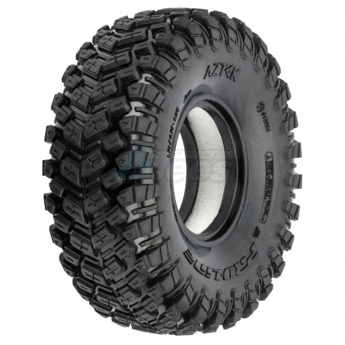 This is a pair of Aztek 1.9" Rock Crawling Tires. Pro-Line proudly announces the release of the Aztek, a revolutionary RC rock-crawling tire designed to redefine off-road performance standards. The Aztek boasts a chevron-shaped, stepped lug tread design, fortified by heavy-duty sidewall lugs with siping for enhanced side-hilling capabilities. This tire is meticulously crafted to conquer any terrain, offering exceptional forward bite in wet or dry, abrasive or slick conditions.