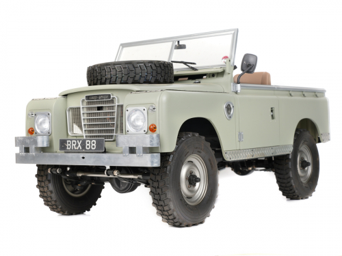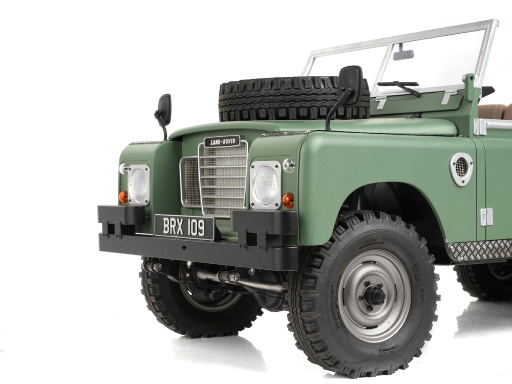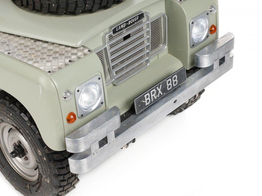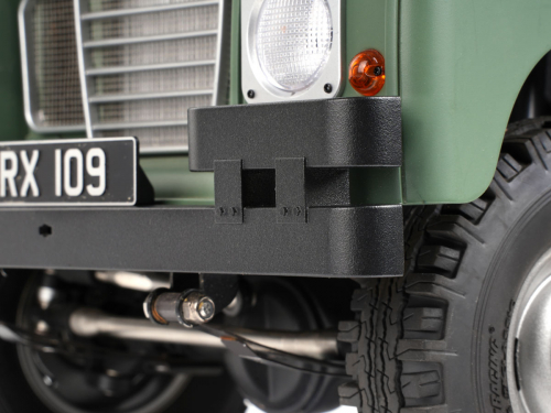 This is a military-style aluminum front bumper for Land Rover off-road vehicles. It is commonly used in military versions of the Series and Lightweight trucks. The bumperettes are molded with the aluminum bumper. The hand crank hole on the bumper gives it an accurate scale look.