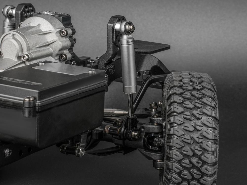 Optimized for scale performance, the KUDU™ Scale Shock Absorber features billet aluminum cylinder body for durability, steel shock shaft with titanium nitride coating, plastic pivot retainers (replaceable) for smoother swivel movements, high-degree pivot angle for high-angle articulation, and double X-Ring oil seals. It comes with cylinder and friction seals to prevent leaks and contaminants from entering. The bump stop provides an additional level of bottoming control, stainless steel pivot balls for stainless, corrosion-resisting pivot rotation, and an aluminum pivot ball tool included for hassle-free maintenance.