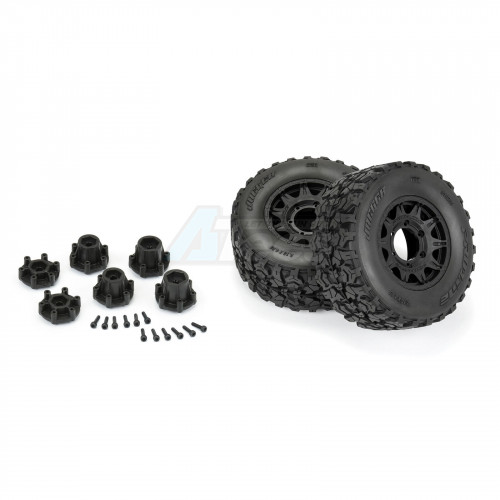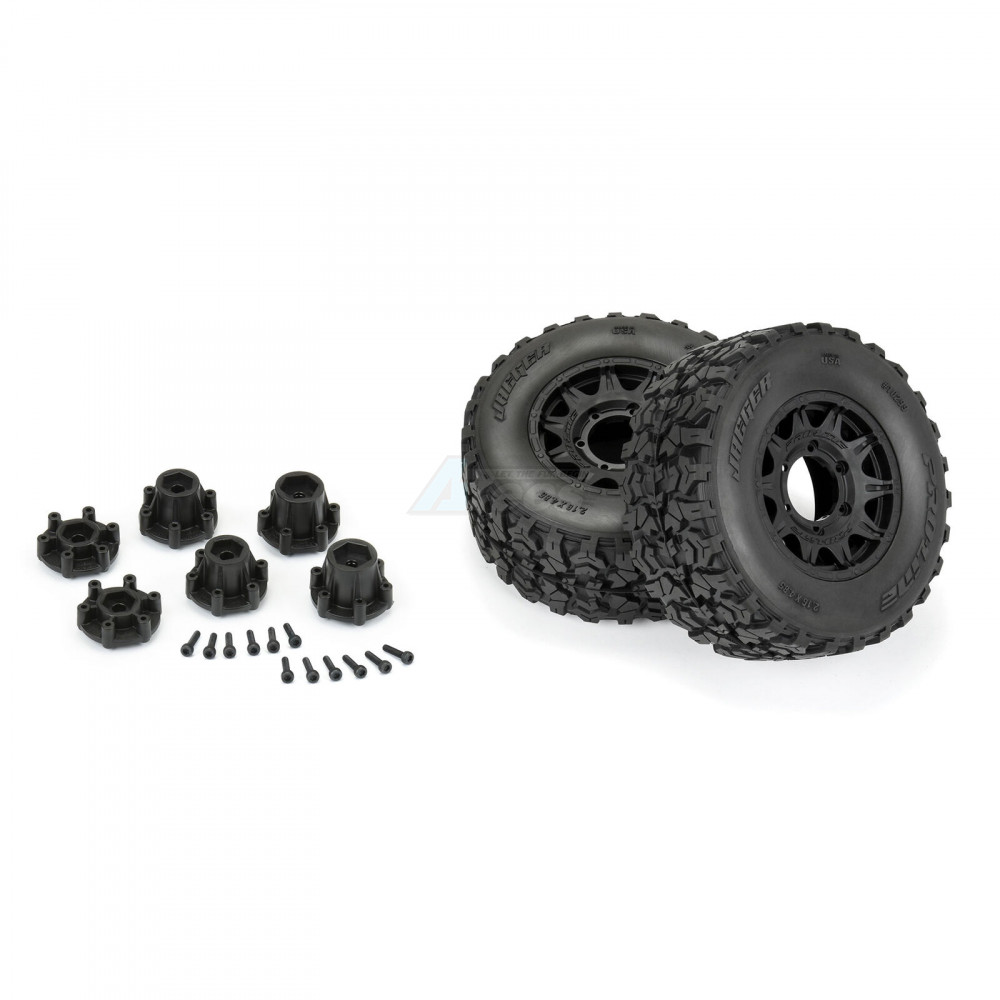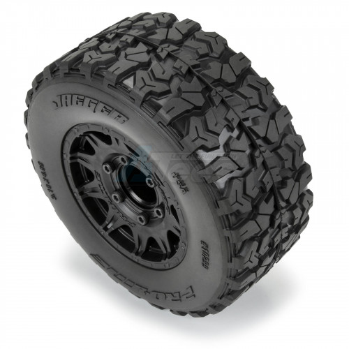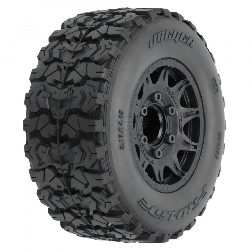 • This is a pair of pre-mounted Jaeger HP 2.8" BELTED All-Terrain Tires Mounted on Raid Black Removable Hex Wheels. Pro-Line has a 2.8" tire with a low profile that can handle high speeds. Meet the Jaeger HP BELTED 1/10 Monster Truck tire! With its aggressive lateral tread design, this tire has the forward bite you desire, while having a self-cleaning ability. The center of the tread features grooves that allow for flexibility over rough terrain while maintaining stability.