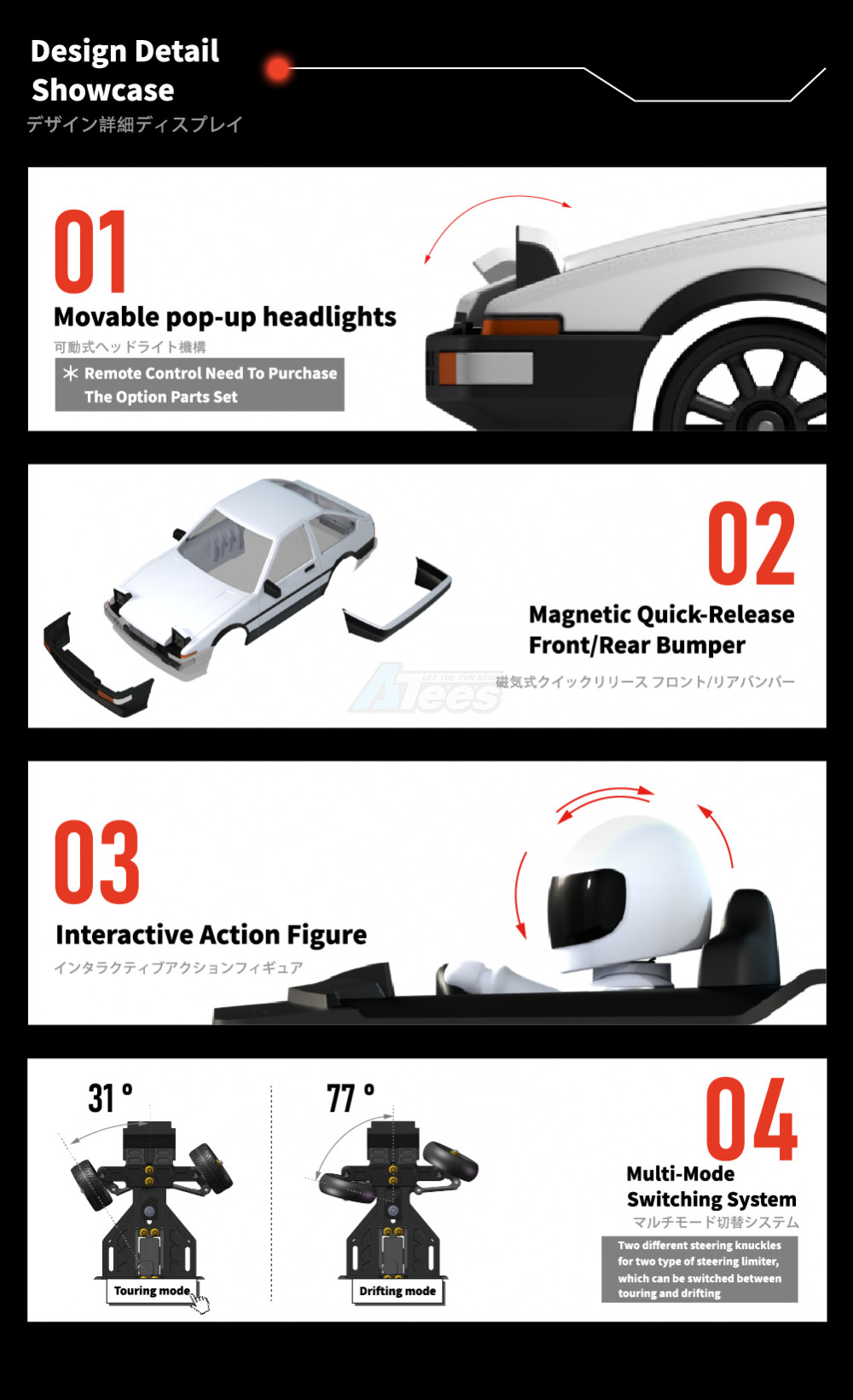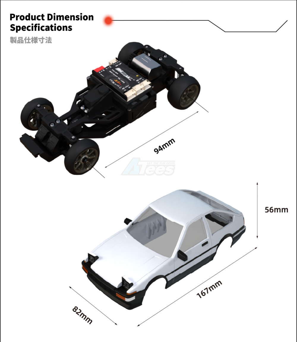 The FLD chassis can fit most of the Kyosho body shell, also it can switch drift mode and touring mode by changing your tires and parts. You can enjoy happiness from drifting or time attack.