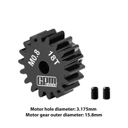 Factory description: GPM Racing 40CR Steel Motor Gear 18T (32 Pitch,Module: 0.8mm,Motor Tooth Diameter: 3.175mm)
