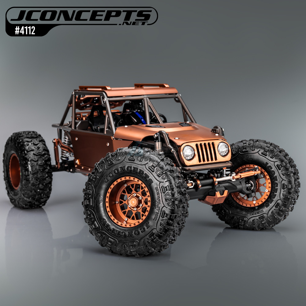 The sidewalls include heavy traction bar placement, removed sections to add pitch and flex grip characteristics. Several “pencil push” plots array the sidewalls with heavy carved and shaved sections in each rotation. A “liquid rope” finalizes the sidewall tread detail to separate where the tread ends, and the tire lettering begins. Recessed JConcepts logo with inner hatching takes position in multiple areas while the 20th Anniversary logo looks strong. The tire naming is shown in prehistoric font with part number 4112 for easy identification.