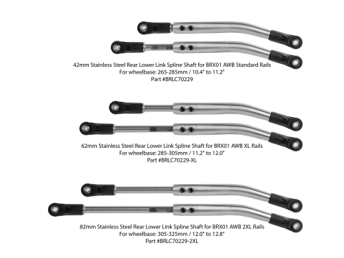 • Factory description: Boom Racing BRX01 AWB 82mm Stainless Steel Adjustable Rear Lower Link Spline Shaft for BRX01 AWB 2XL Rails 265-285mm / 10.4"-11.2" (2)