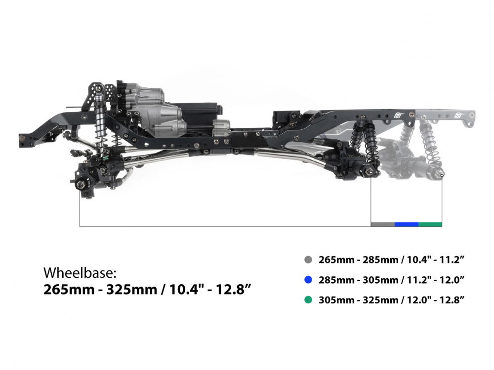 The stock wheelbase range is 265–285mm (10.4–11.2"). The front section of the chassis, including the front links and suspension geometry, remains fixed and does not move.