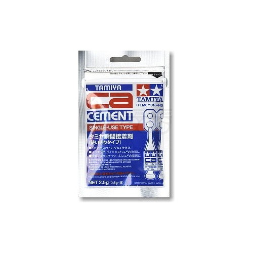 Tamiya has now packaged CA cement in smaller 0.5g tubes that can be conveniently used in one time, thereby eliminating waste. It can be used with plastics, metal, and synthetic parts for quick application. - Product weight: 12.00 grams
