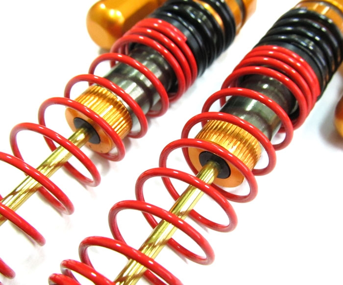 • Double spring setup for extra progressive damping effect. It has higher range than 1 progressive spring. The effects of one progressive spring is not enough for RC cars as it is much lighter than real cars. Double suspension however gives a good simulation of real car progressive spring effects.