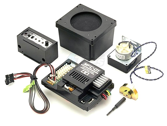 By using your transmitter sticks and the trims you can control the truck movements (forward/backward running and turns), horn, motorized support legs (Item #56505) (sold separately), headlights, position lamps, roof lamps and speed indicators. You can also activate the back lamp, tail lamps and blinkers/hazard lamps as well as engine revving.This Multi-Function Control Unit makes your 1/14 scale R/C tractor come to life: sounds, lights, and vibration can be recreated. The brain of this unit, MFC-01 operates these effects and actions synchronizing them with vehicle movement. Engine sound has been digitally recorded from a diesel engine.