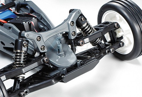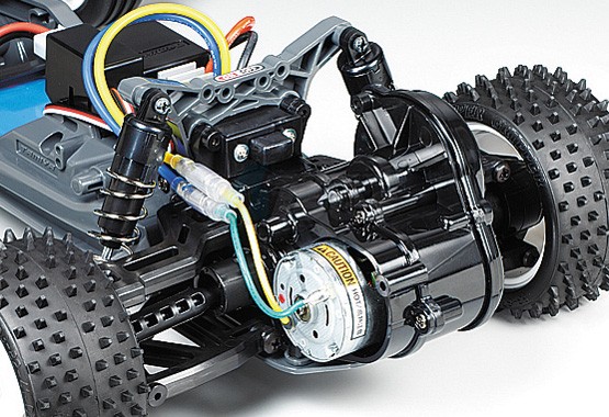 The combination of a long 287mm wheelbase and 4-wheel double wishbone suspension married to friction dampers with long arms, allows the model to handle with stability on poor surfaces. Ribbed front and square spike rear tires provide ample grip, and the rear-positioned gearbox is sealed to protect from dust and dirt, with the built-in differential gear offering smooth cornering.