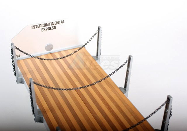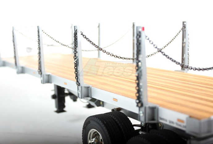 This highly realistic 1/14 scale flatbead semi-trailer model is for use in combination with Tamiya's 1/14 R/C tractor truck. A scale appearance is achieved by using authentic components such as aluminum chassis/frame, wood-floored platform and actual chains.